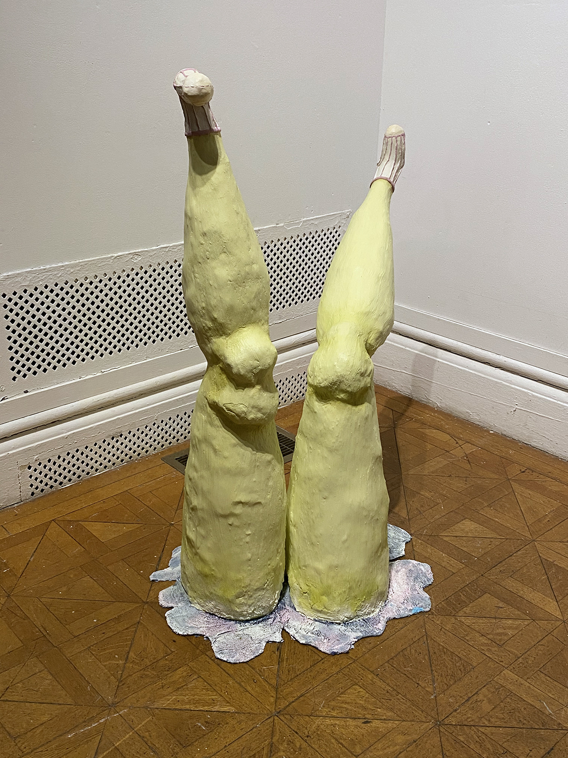 This body of work reflects on memories of ‘coming-of-age’ and the influence of memory in the continual process of aging/becoming. The work draws inspiration from the processes through which memory is formed, retained, and disrupted. The memories represented are my own but reflect experiences and emotions that are commonly shared during ‘coming-of-age’ as shown through film, television, literature, mythology, art history. This body of work consists of paired sculpted legs and autonomously generated landscapes representing five of the main ‘coming-of-age’ experiences; embarrassment, sex , rebellion, independence, and ceremony.